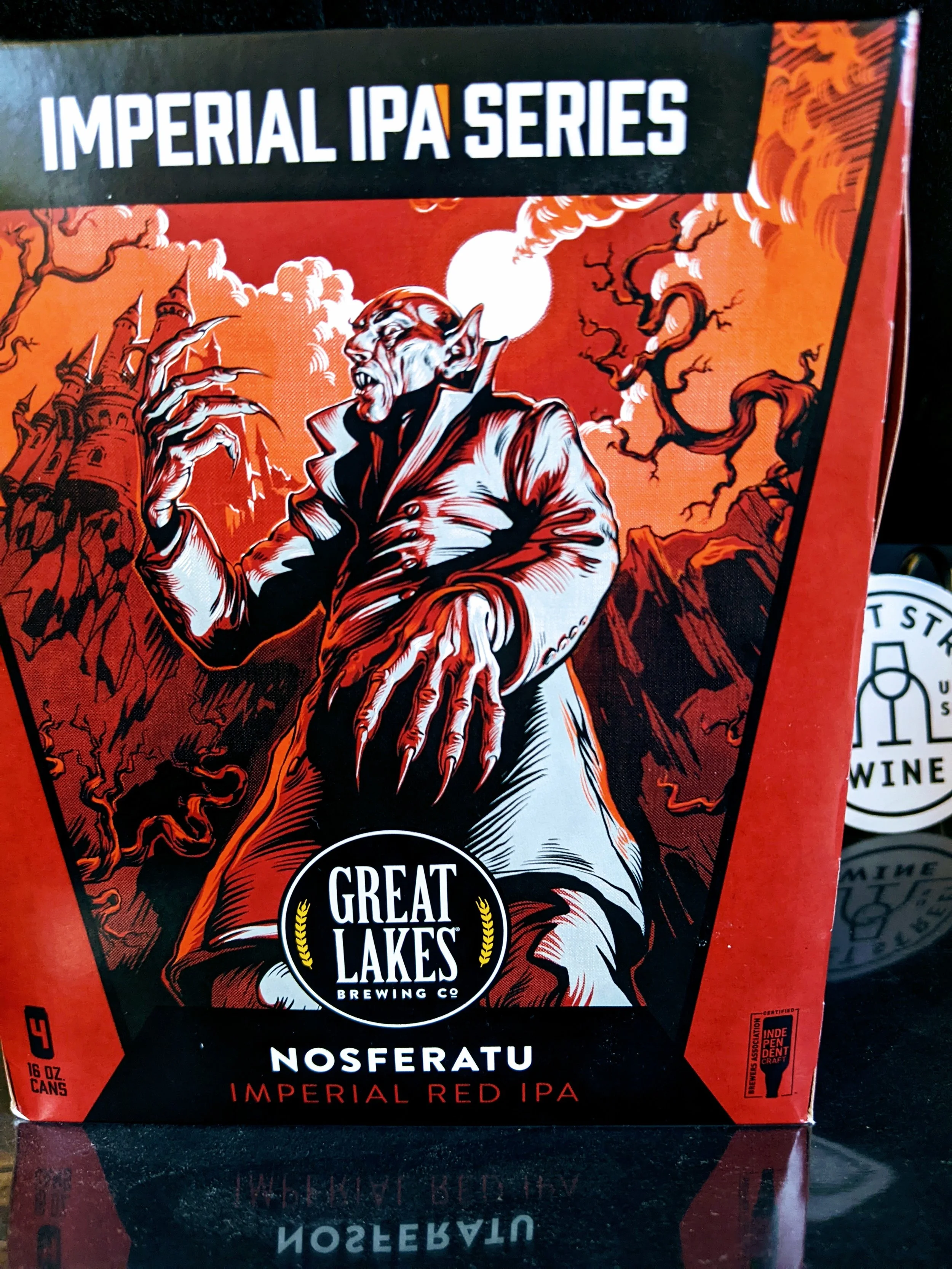 The Nosferatu starts with a 2-Row base malt, Crystal 77, and a Special Roast malt giving you a deep red ale taste that flirts with caramel notes. Great Lakes then throws in Simcoe and Cascade hops because they are not messing around! They’re balanced by the malt bill, so you’re not overwhelmed with bitterness but do get that classic West Coast grapefruit citrus flavor.