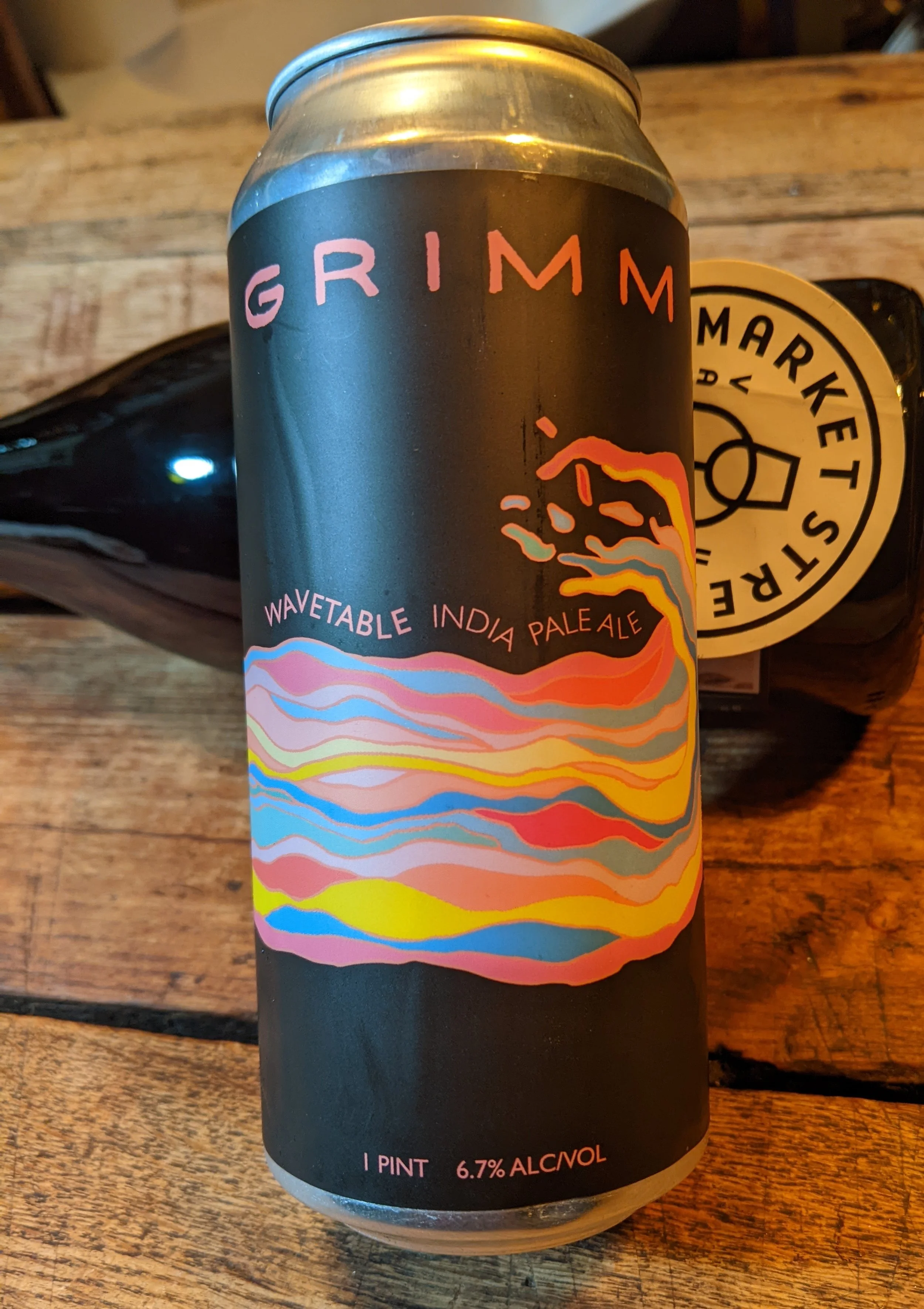 For the Wavetable, Joe Grimm uses Strata, Mosaic, and Citra hops, while Lauren Carter Grimm designs the label. We get pineapple right up front, which gives way to a citrusy zest on the finish. Think of the juice/tart mix of a dry lemon Jolly Rancher.
