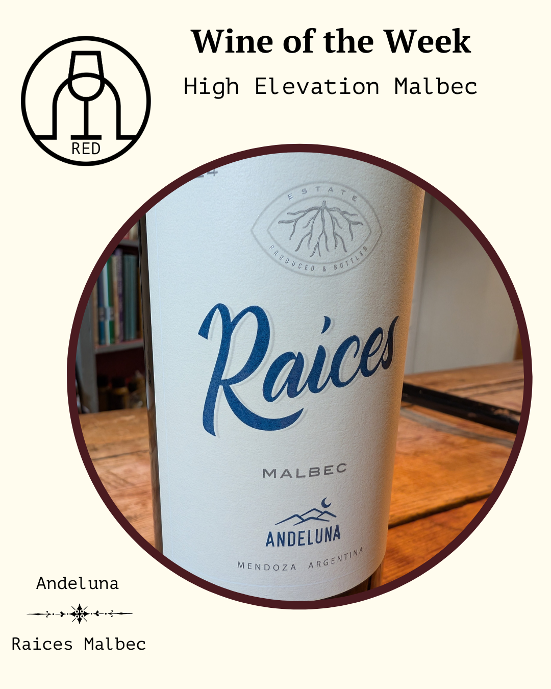 Andeluna has this to say about their Raices (“Roots”) line. “Our roots are our great base, capitalized by inheritance and history and will remain within our earthly heart throughout our existence, just as it happens to vines.” They grow the grapes for this wine 2600 feet above sea level in rocky, sandy, and calcareous soil.