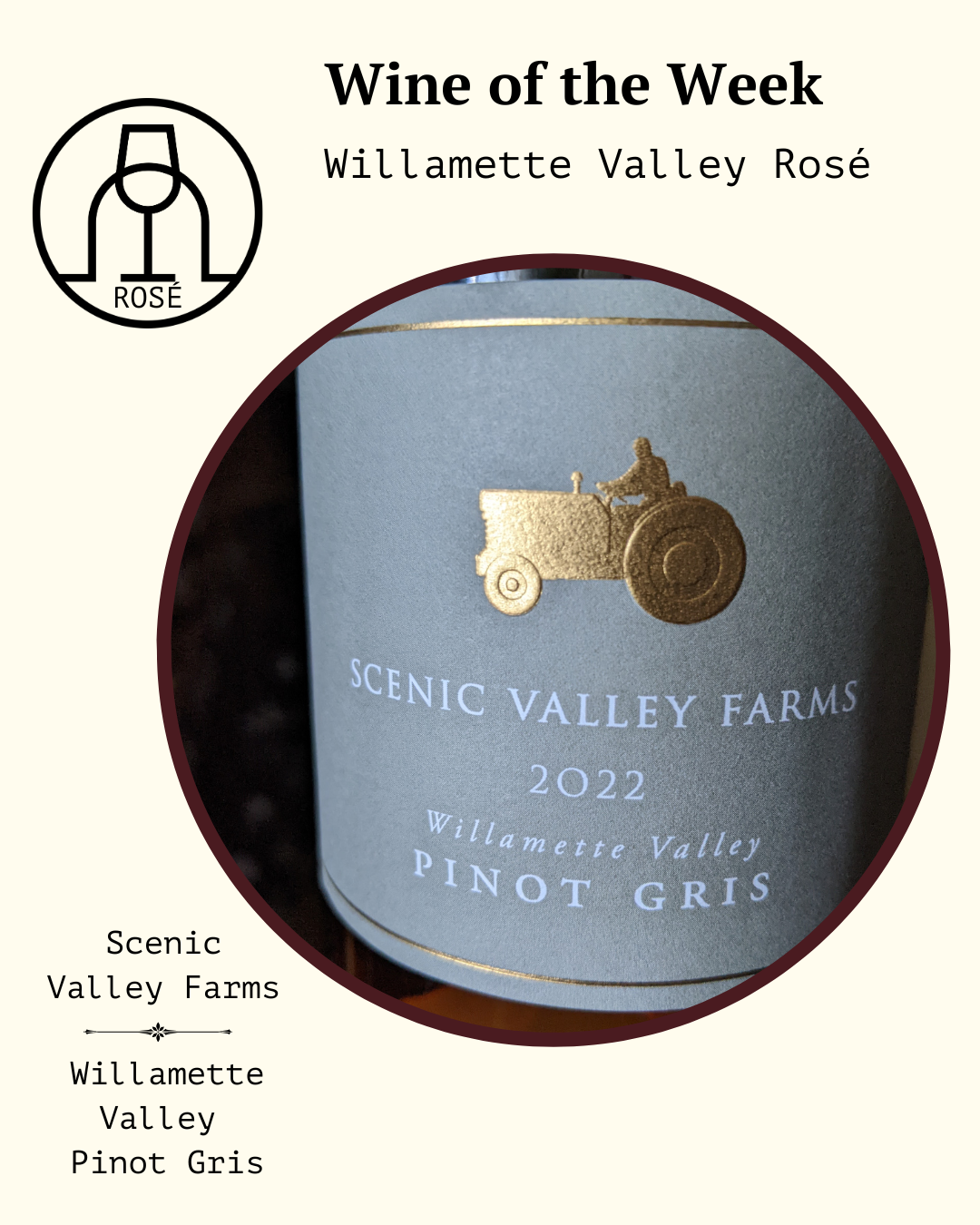 Scenic Valley Farms makes this Pinot Gris with grapes — half from organic Wild Hare Vineyards in central California’s Lake County and half from their own sustainably farmed vineyards. The grapes spend a week undergoing carbonic maceration to bring out the fruit and to give the resultant wine color. After fermentation, they age 15% of the wine in new Oregon oak barrels.